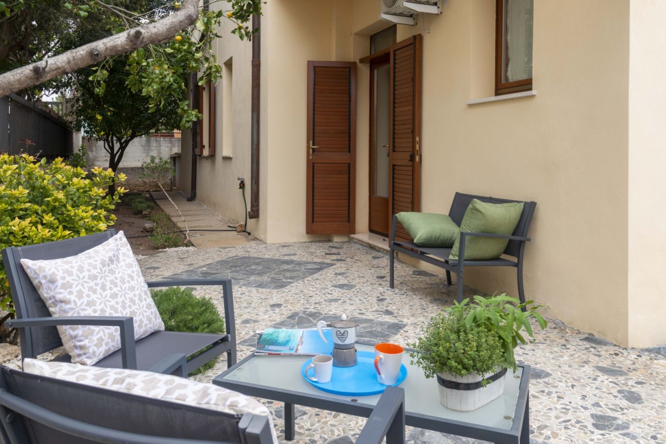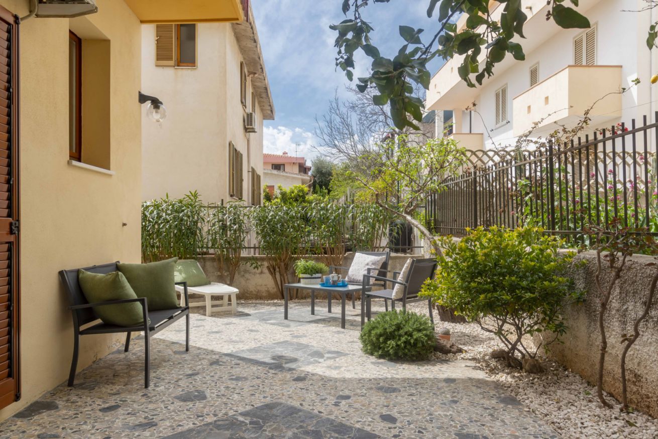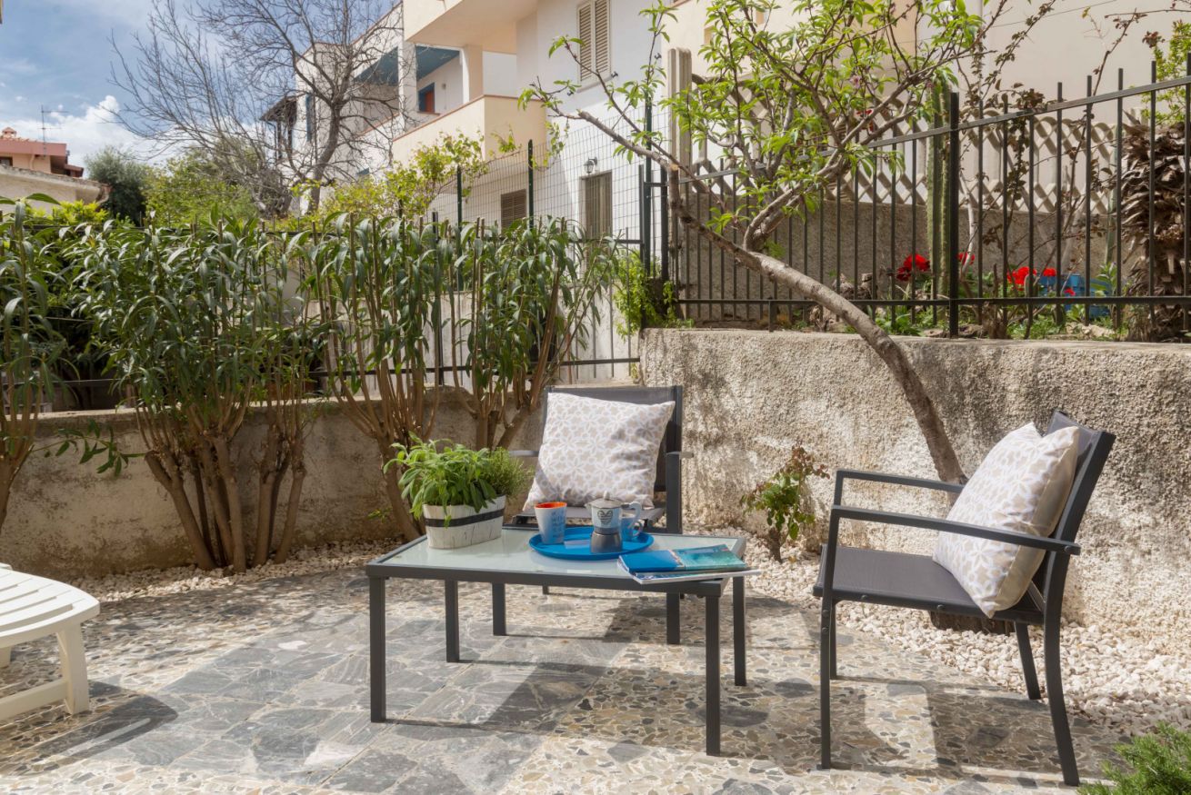 Appartamento al piano terra (sollevato di pochi gradini), curato e accessoriato di tutto ciò di cui c'è bisogno per godere di una vacanza in serenità. Grazie alla posizione centrale di questo alloggio, potrai accedere facilmente a tutte le attrazioni locali e goderti il mare. Air-condition, posti auto liberi in strada davanti alla casa, wifi, terrazza con giardino, 2 camere da letto e 1 bagno.